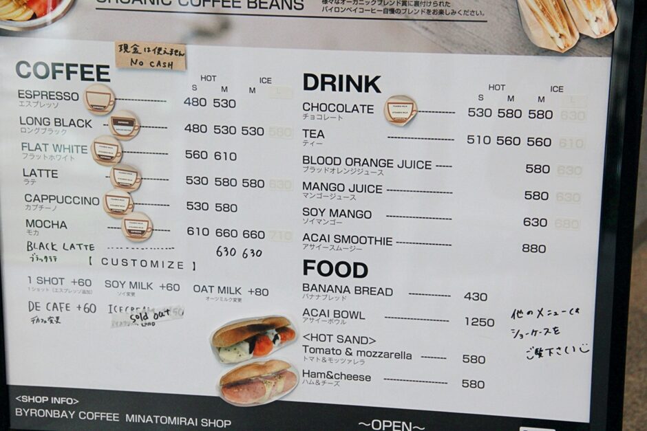 「BYRON BAY COFFEE みなとみらい店」は、キャッシュレスのみ。オーストラリア発祥のカフェなので、フラットホワイトやロングブラックなど、エスプレッソを中心としたドリンクがメインです。サイズもSとMとあるので、好みに合わせて選べます。