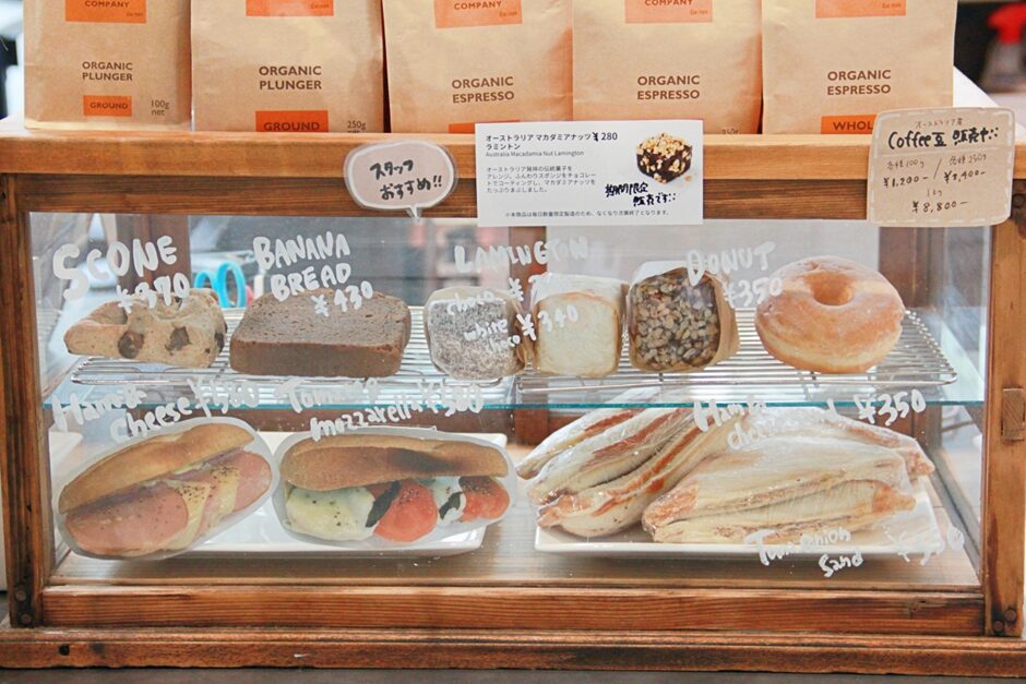 もうひとつ迷ったのが、コーヒーのお供。スコーンにバナナブレッド、ラミントン、ドーナツとどれもコーヒーとの相性が良いものばかりです。簡単なサンドイッチは350円とお手頃価格なのもうれしいですね。