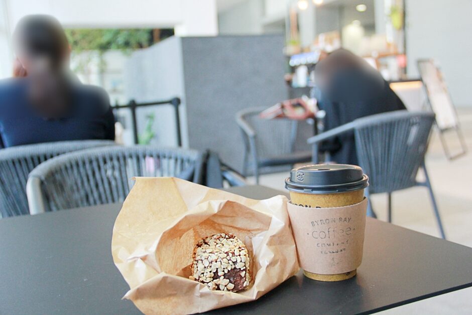 今回はカフェラテのSサイズと期間限定のラミントンにしました。普通のラミントンより大きいサイズなのもうれしいポイントです。