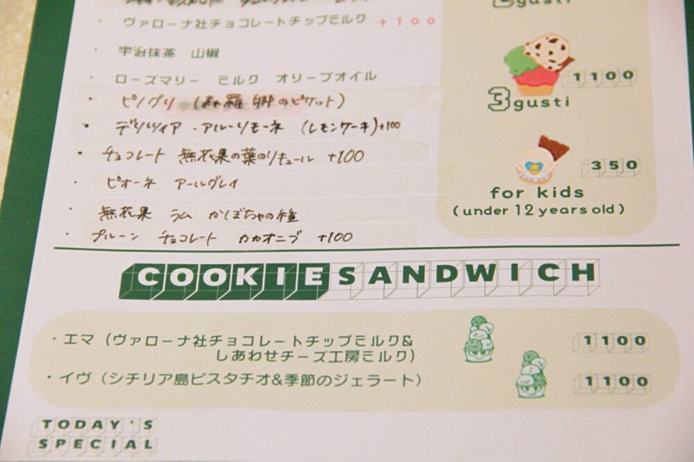 店頭には、その日のおすすめジェラートとカレンダーも掲示されています。今年は暑い日が続いたので、夜遅くのアイスは人気があったのではないでしょうか。
