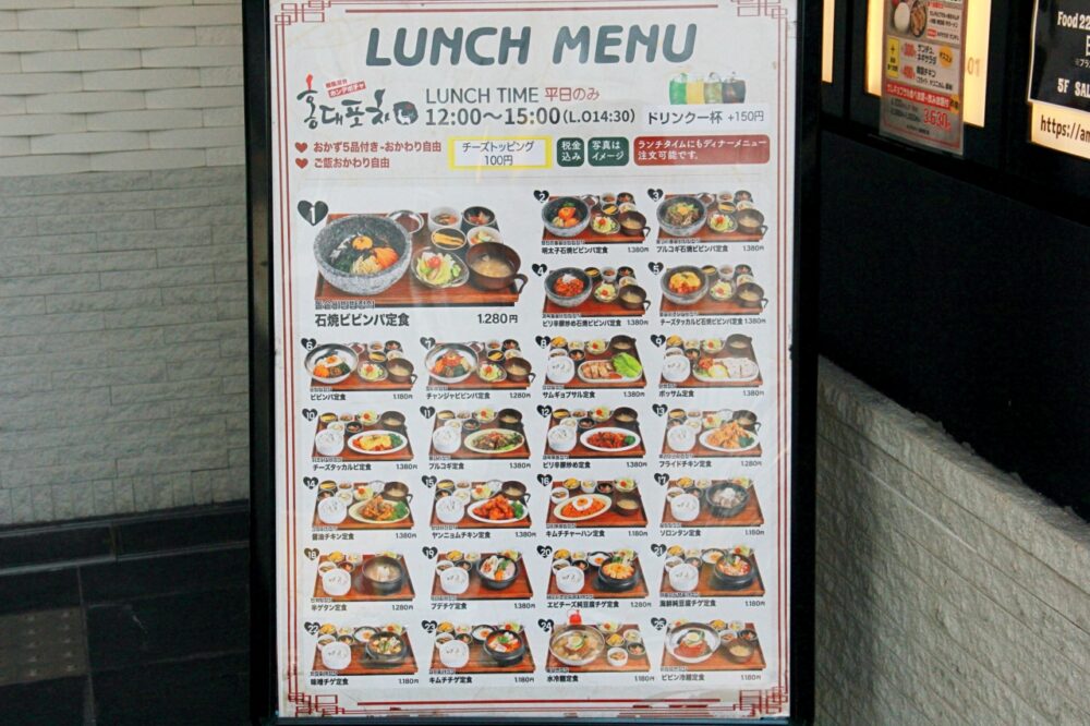 平日は韓国料理の定食ランチが楽しめるのも魅力ですね。石焼ビビンバやサムギョプサル、チーズタッカルビなど、どれも食べてみたいメニューが並びます。