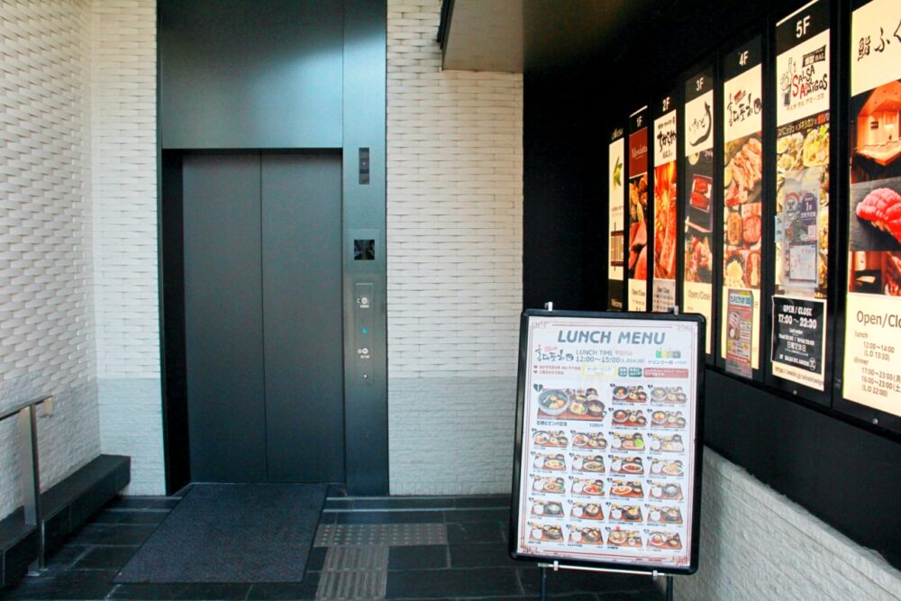 細長いビルなので、思いっきり前を通り過ぎてしまいましたが、MAPを頼りに戻ると、エレベーター前に看板を見つけました!
