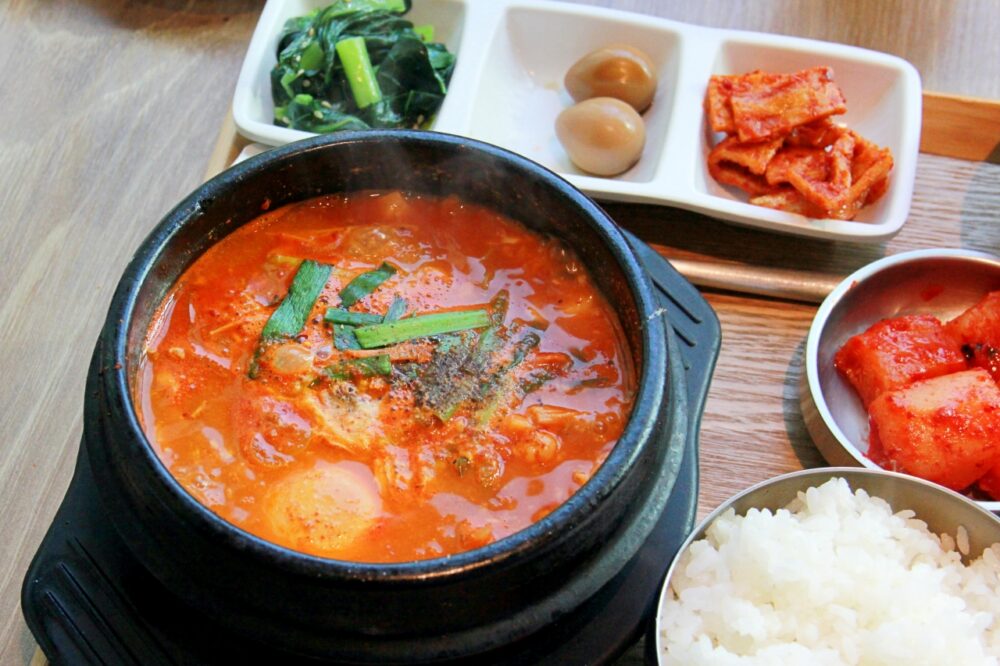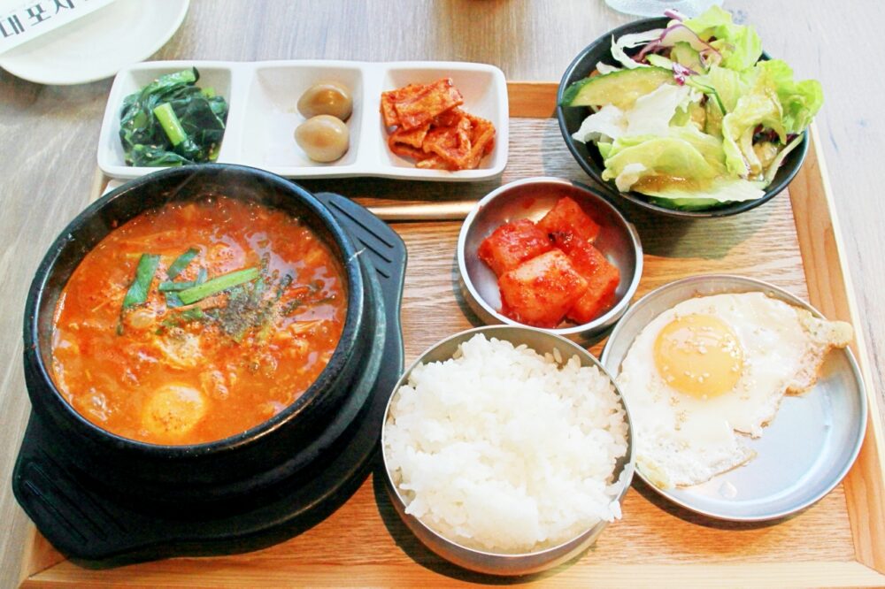 今回注文したのは、海鮮チゲの定食です。熱々のチゲ鍋からのよい香りが食欲をそそりますね。
