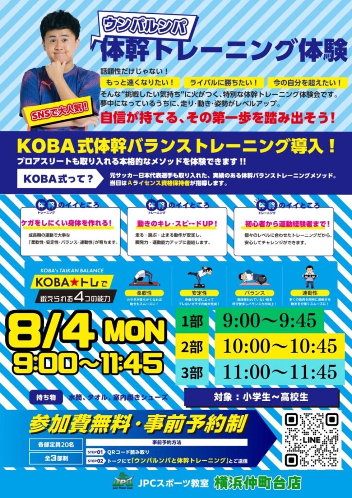 JPCスポーツ教室仲町台店では、しっかりと知識と KOBAトレーニングのA級ライセンス以上の資格を持ったコーチが メニューを組み合わせ、フォームを確認しながら、子供と同じ目線に立ち指導をしていきます。