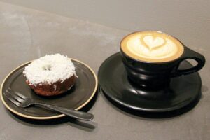 今回は、ココナッツチョコのドーナツとカフェラテを注文。ラテはいうまでもなくとてもきれいなリーフとハートのデザイン。