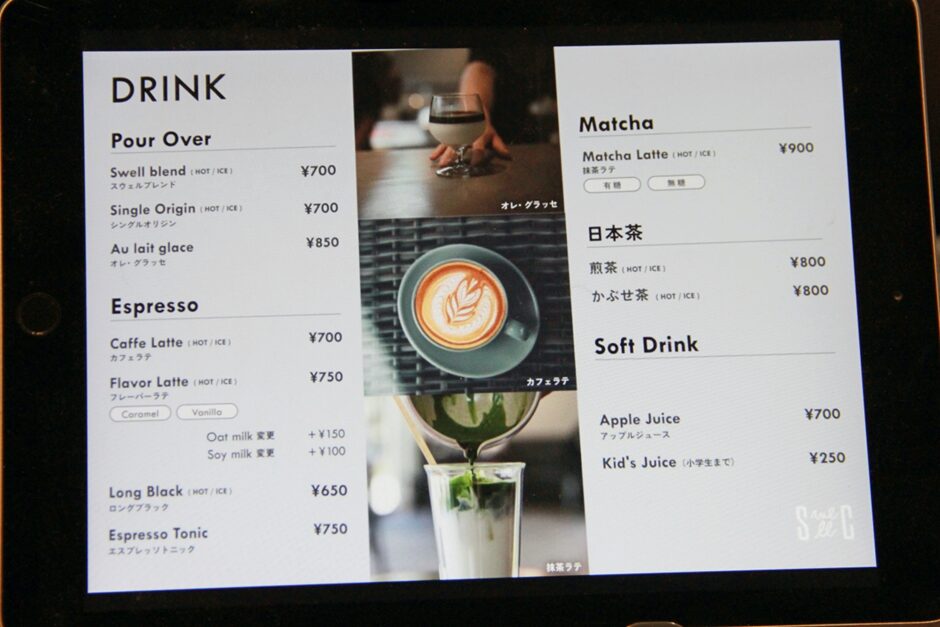 「SWELL COFFEE ROASTERS lab」のメニューです。話題のカフェラテはもちろん、抹茶や日本茶も用意。
