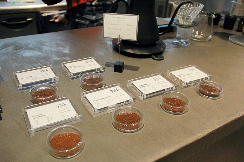 エチオピアやブラジル、グアテマラなどの豆が並んでいますね。香りを楽しみながらどの豆にするか選べるのもうれしいポイントです。