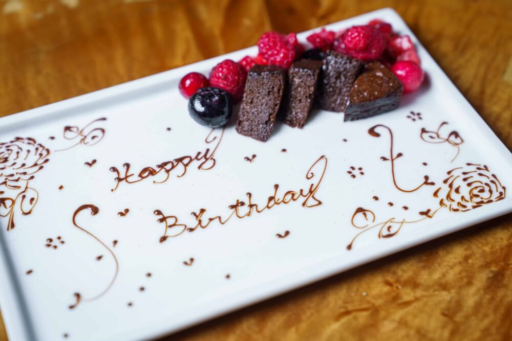 誕生日や記念日のコース利用には、メッセージ付きのデザートプレートのサービスがあり、1枚目は無料とのこと。